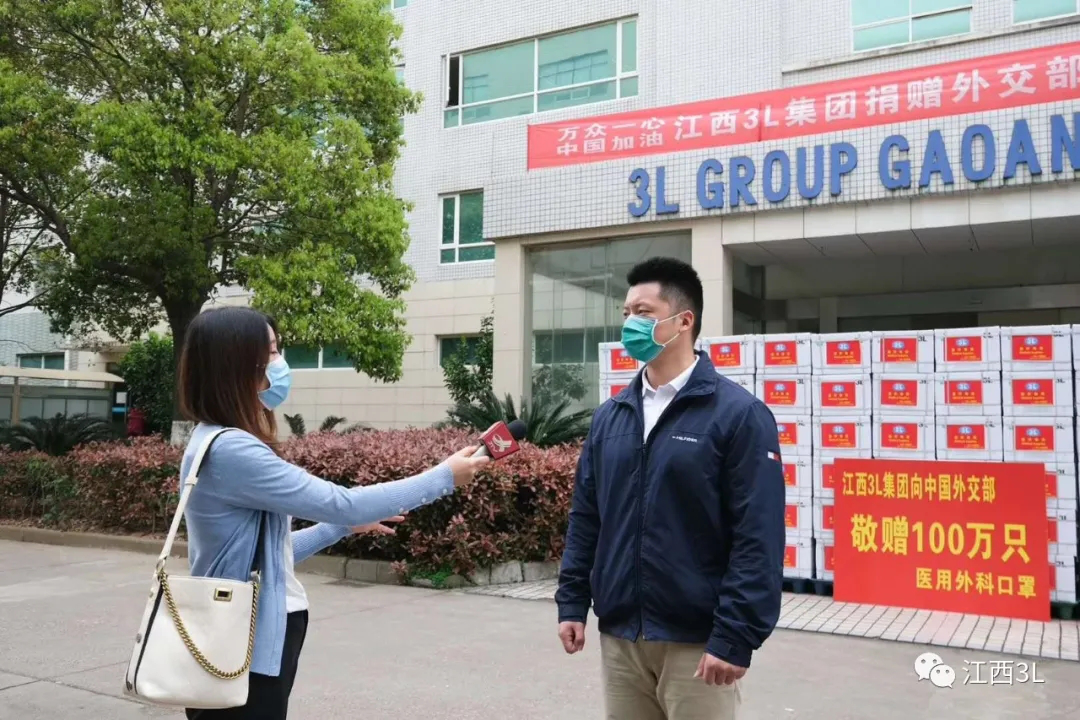 由江西3L医用制品集团股份有限公司向我国外交部捐赠的100万只医用外科口罩,3月22日上午在集团公司高安生产基地举行了捐赠仪式并装车发运北京。该批口罩主要用于我国驻外使领馆工作人员和当地侨民的疫情防控。江西省电视台进行了现场报道,集团公司总经理周峰接受了省电视台记者的现场采访。