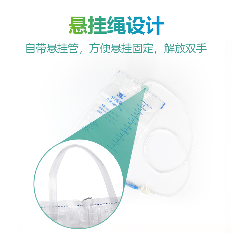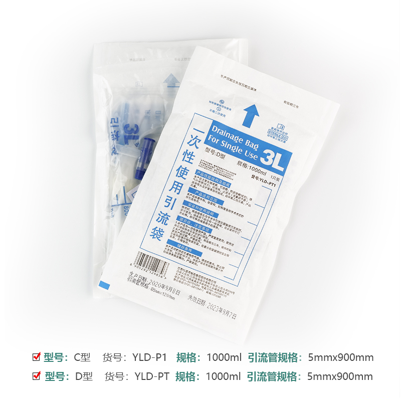 一次性使用引流袋:由储液袋、引流管、防逆流瓣(或无)、透气纤维膜(或无)、排液阀、止流夹(或流量调节器)、连接锥头及护套等部件组成. 用于患者治疗过程中收集分泌物和体液。