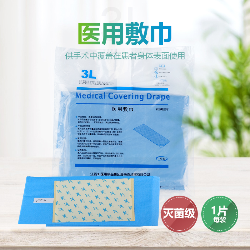 医用敷巾:由淋膜无纺布或非淋膜无纺布与聚乙烯膜、铝芯线或铝片、医用压敏胶、离型隔离纸制成。供手术中覆盖在患者身体表面使用。其中C型、D型医用敷巾中的配袋用于收集手术中少量废液、废弃物或引流手术中废液。